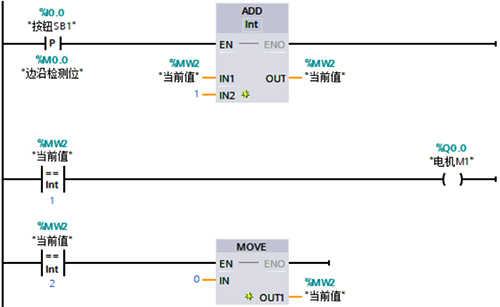 按下按鈕SB1(I0.0),當前值(MW2,初始值為0)加1,判斷當前值不等于0成立,Q0.0置位,電機MI啟動。