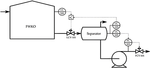 對于FWKO罐,液位為控制變量,出口流量閥LCV-101為操縱變量。對于分離器,由于泵的非線性動力學,采用串級液位(LC-102)輸出流量(FC-101)控制回路來改進液位控制。