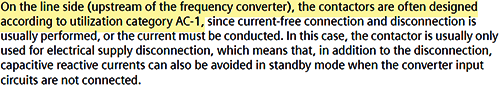 所以,在西門子技術文件《Industrial Controls System Manual》中,對于變頻器前端的進線接觸器K1(圖7),也推薦采用AC-1使用類別選型(圖6)。