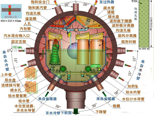 沿汽包長度在兩側裝設若干旋風分離器,每個旋風分離器筒體頂部配置有百頁窗(波形板)分離器,它們的主要作用是將由上升管引入的汽水混合物進行汽和水的初步分離。在汽包的中上部,水平裝沒蒸汽清洗孔板,其上有清潔給水層,當蒸汽穿過水層時,便將溶于蒸汽或攜帶的部分鹽分轉溶于水中,以降低蒸汽的含鹽??拷捻敳吭O有多孔板,均勻汽包上升蒸汽流,并將蒸汽中的水分進一步分離出來。汽包中心線以下150mm左右設有事故放水管口;正常水位線下約200mm處設有連續排污管口,再下面布置加藥管。下降管入口處還裝設了十字擋板.以防止下降管口產生漩渦斗造成下降管帶汽。