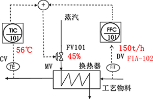 在如下圖所示的換熱器出口溫度控制中,工藝物料為150t/h,蒸汽閥位45%,則前饋系數FFC101=MV/DV=45/150=0.3,因為是正相關,所以就是0.3。這種用絕對量計算本質增量的前饋系數的方法,并不能總是奏效,要注意適用范圍;