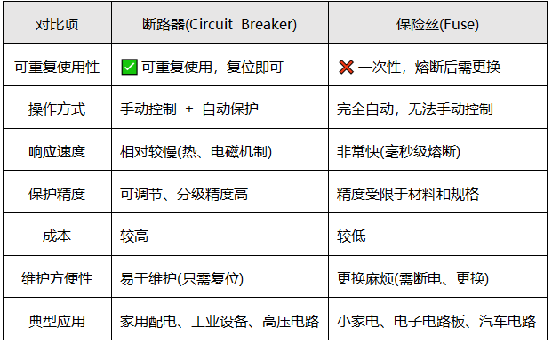 一句話說斷路器和保險絲的區別:斷路器是能斷還能復位的自動開關,保險絲是一次性燒斷即換的電流保險。
