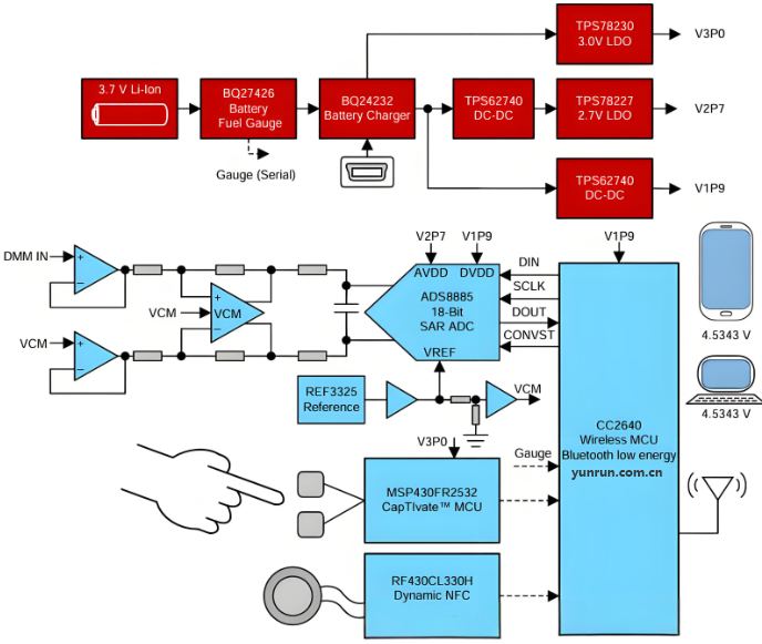 bq27426電量計可以準確預測單個鋰基可充電電池的容量和其他運行特性。系統處理器可以查詢它,以提供電池狀態信息,例如電荷狀態(SoC)。