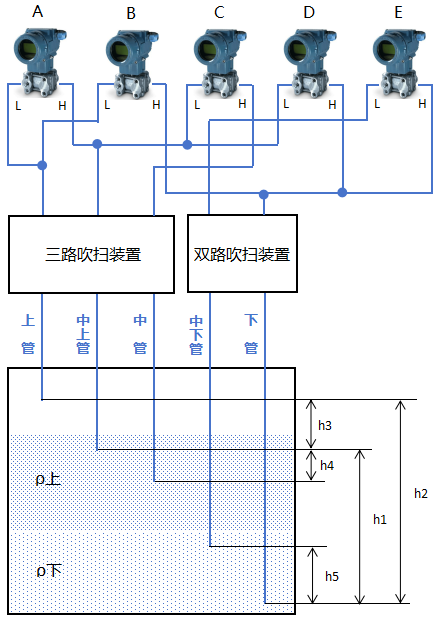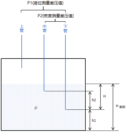 液相吹氣管內壓力:P1=P液,氣相吹氣管內壓力:P2=P氣,則所測介質深度處壓力值:△P=P2-P1,被測介質密度ρ,設備所在地重力加速度g,則介質可被測量到的液位高度變化H:H=△P/(ρ×g),容器實際液位高度H實際:H實際=H+h1。