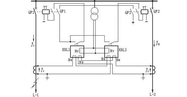 當一回線路發生故障(如線路L-1的K點),由于II>I2,并由于電壓大大降低,電壓線圈的反作用力矩顯著減少,因此KBL1中由II產生的動作力矩Mw1大于I2產生的制動力矩MB1與電壓產生的制動力矩Mv之和,所以KBL1動作,切除故障線路L-1;對于KBL2,由于流過其制動線圈的電流II大于工作線圈流過電流I2,即制動力矩大于動作力矩,所以它不會動作。