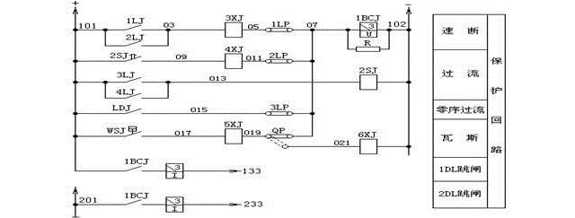 從圖中很容易看清繼電保護的動作過程。例如速斷保護,當速斷保護的電流繼電器1LJ或2LJ動作后,直流正電源就加到了信號繼電器3XJ和保護出口繼電器1BCJ線圈上。1BCJ動作后,分別跳開1DL、2DL斷路器。