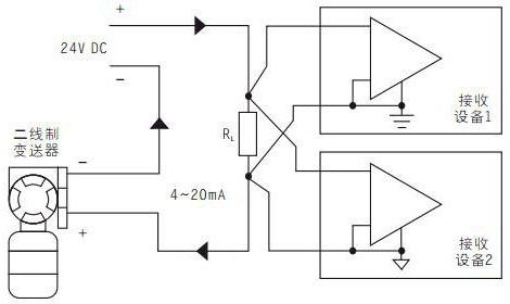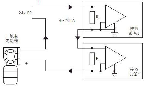 在應用中,我們還會經常遇到將一個變送器信號接入兩個或兩個以上接收裝置的情況,若采用串聯環路,則環路中任一處開路都會造成整個環路上的儀表無信號,而且負載電阻之和很容易超過變送器的負載能力 還必須保證兩個負載信號之間參考點不一樣,如圖3。
