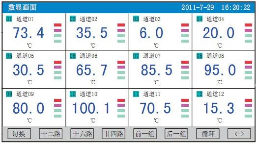 YR-ASR600型無紙記錄儀安裝在值班室內,無紙記錄儀的實時曲線畫面同時顯示六組數據值,數顯畫面能同時顯示十二組數據值,操作人員主要通過這兩種顯示方式監測觀察生產線運行情況。如窯頭看火工根據無紙記錄儀顯示的溫度和自己多年積累的觀火經驗,及時地調整窯的運轉狀態;如水泥窯煙室溫度過高或者過低時無紙記錄儀會發出測量值報警提示和連鎖閃光報警器報警,操作人員就能及時調整噴煤機轉速去改變喂煤量的大小,保證生產出質量好、產量高、消耗低的熟料。