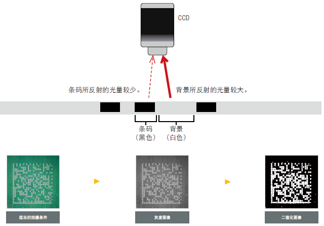 CCD是通過識別對比(黑與白)上的差異來對二維條碼進行讀取,原理如下圖所示。DPM條碼的讀取一般比較困難,這是因為反射的光亮不僅卻決于條碼的顏色和背景,還跟材料、表面狀況、不規則等條件有關。